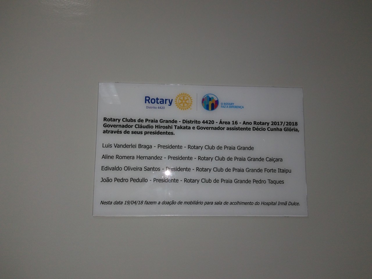 Entrega da Placa na Sala de Acolhimento do Hospital Irmã Dulce com verba do Subsídio Distrital do Rotary Internacional Área 16